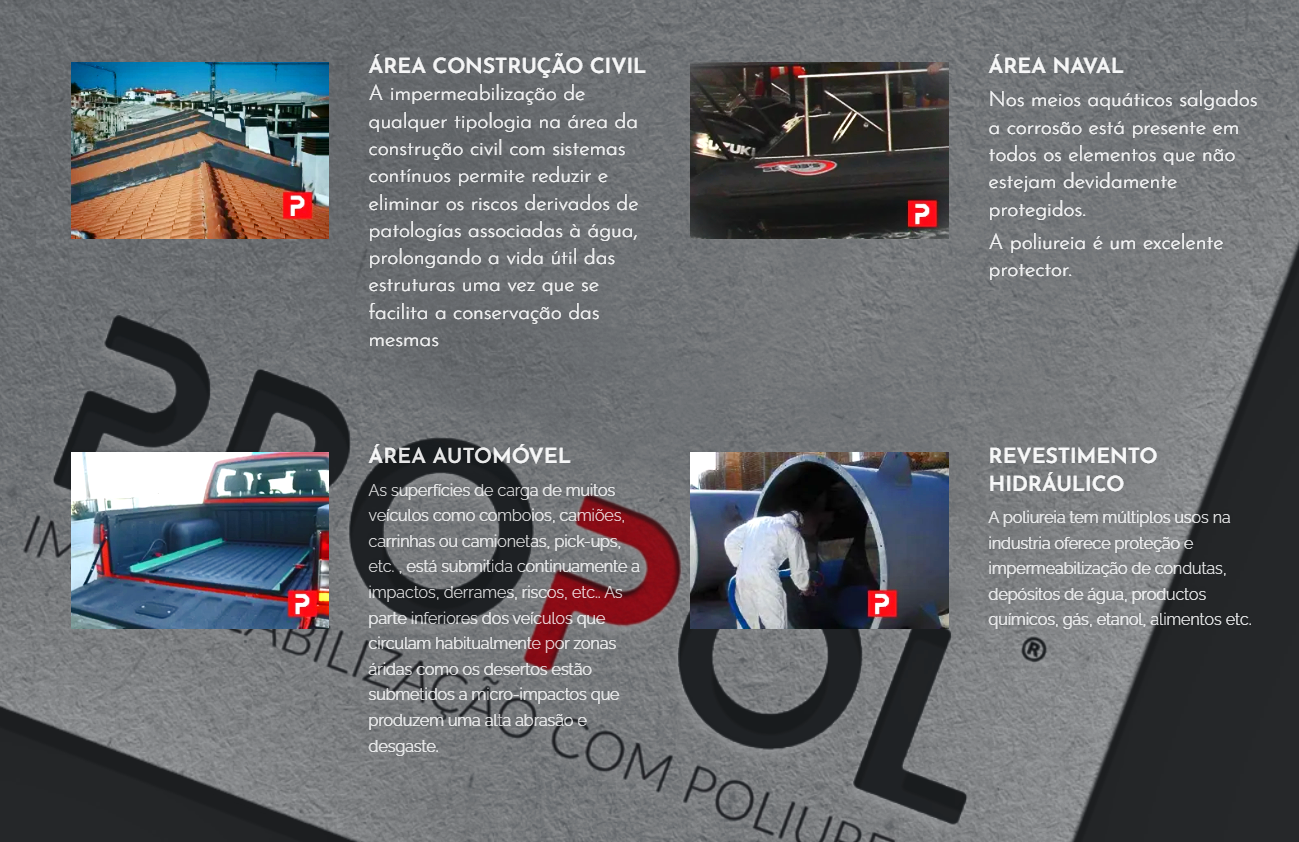 A poliureia tem múltiplos usos na indústria oferece proteção e impermeabilização de condutas, depósitos de água, productos químicos, gás, etanol, alimentos etc.